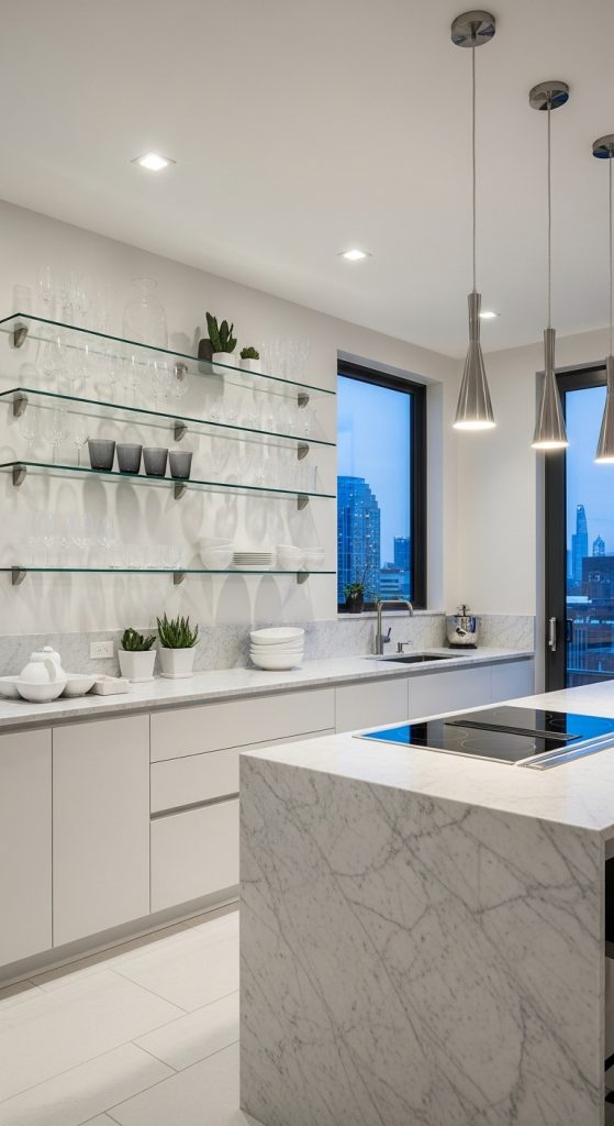 - Pair the glass shelves with chrome brackets or clear acrylic supports for a completely transparent look.