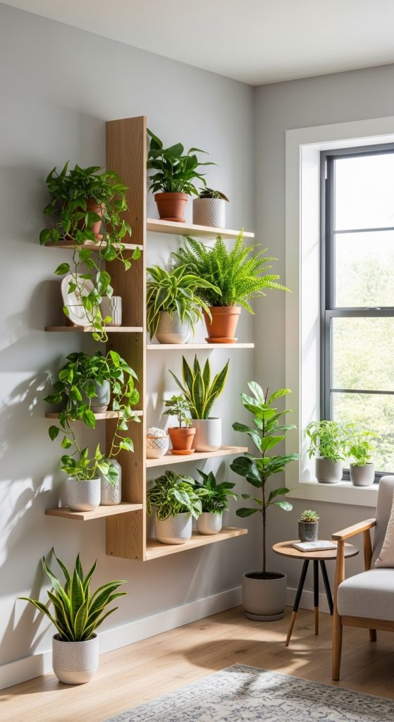This approach creates a fresh, vibrant feel while keeping the plants organized and off the floor.
